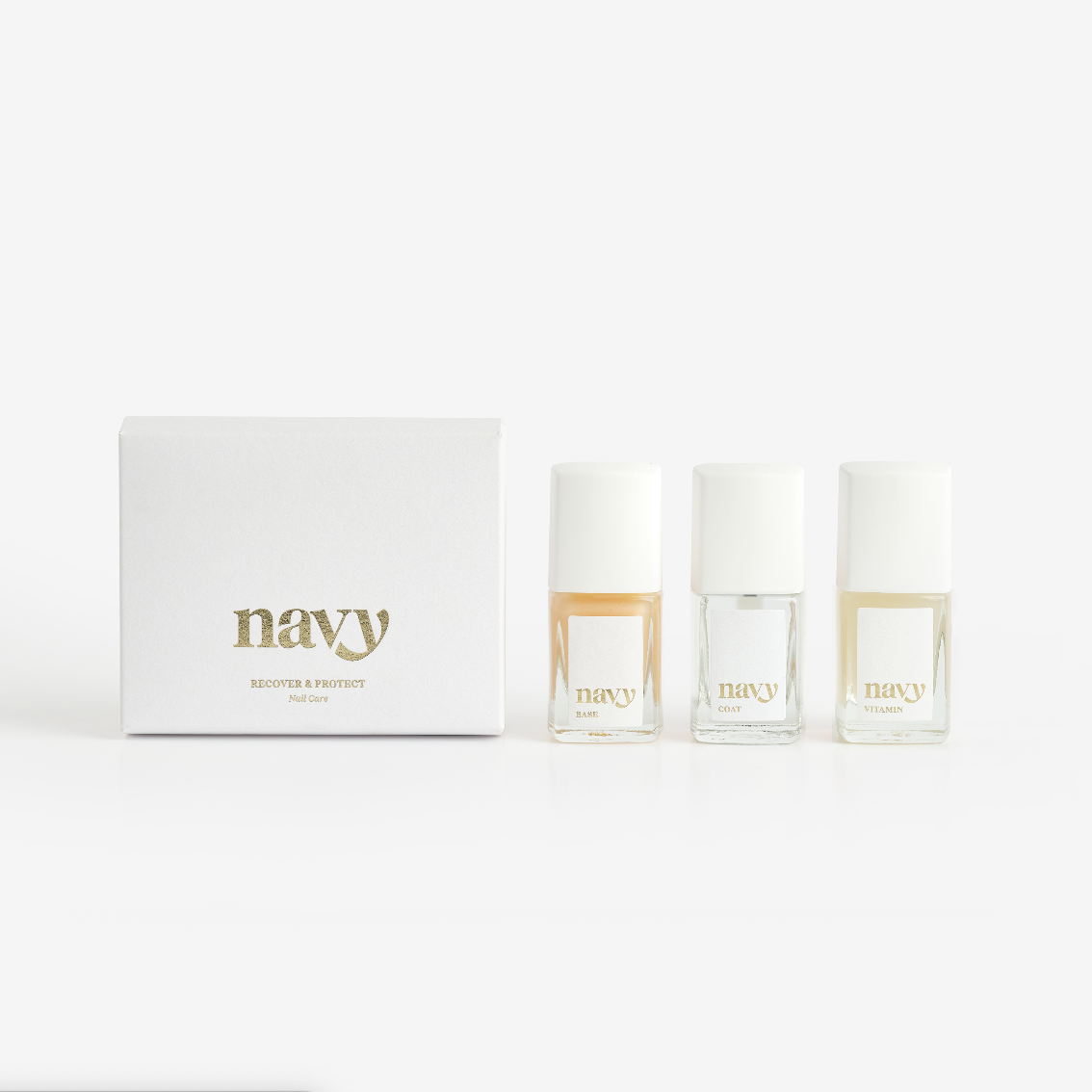 Introducing the Navy Recover & Protect Nail Treatment Kit – a complete three-step system designed to restore, strengthen, and protect natural nails. Expertly formulated by professional manicurists, each treatment works in harmony to repair damage, improve resilience, and shield nails from future stress, while delivering a healthy, radiant finish.