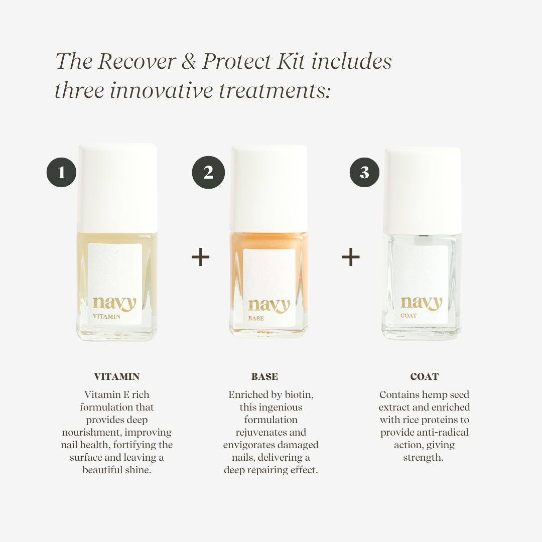 Part of the exclusive Navy Bare Collection, the Recover & Protect Kit is the ultimate solution for anyone seeking healthier, stronger, and more beautiful nails.
