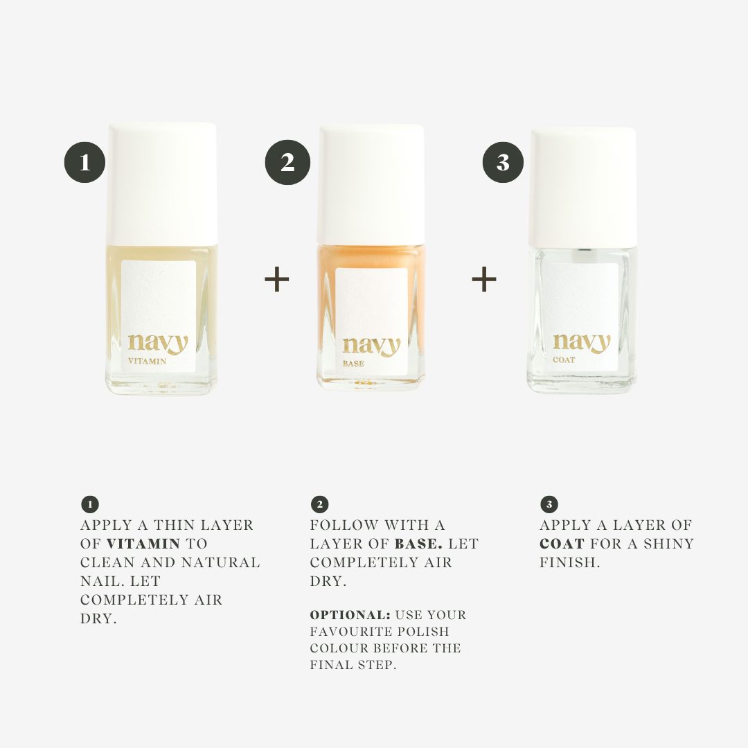 • Step 1: Apply a thin coat of Vitamin E-rich formula to clean nails. Let dry.