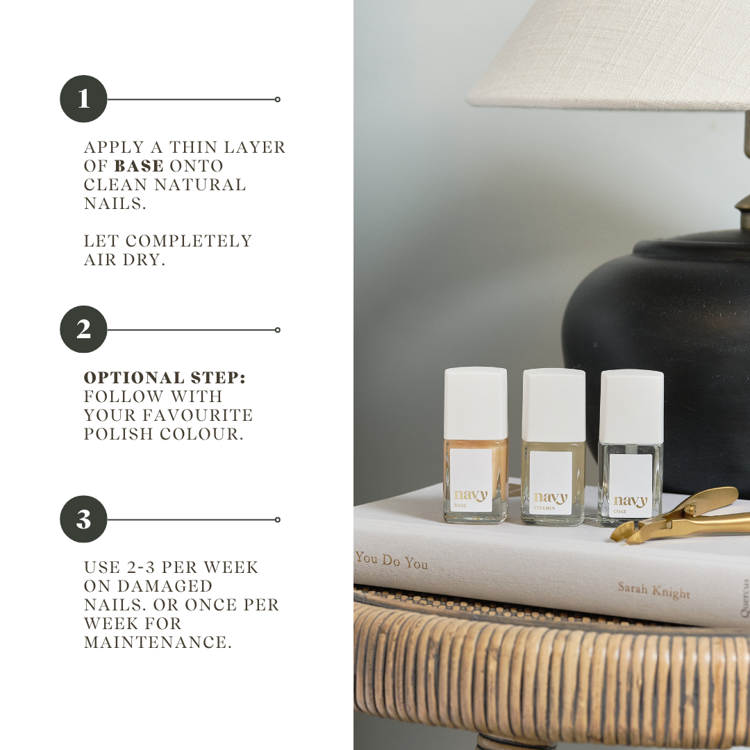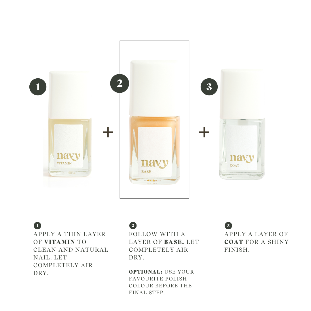 • Apply a thin layer to the natural nail and allow to fully dry, follow up with your chosen colour, followed by a top coat.