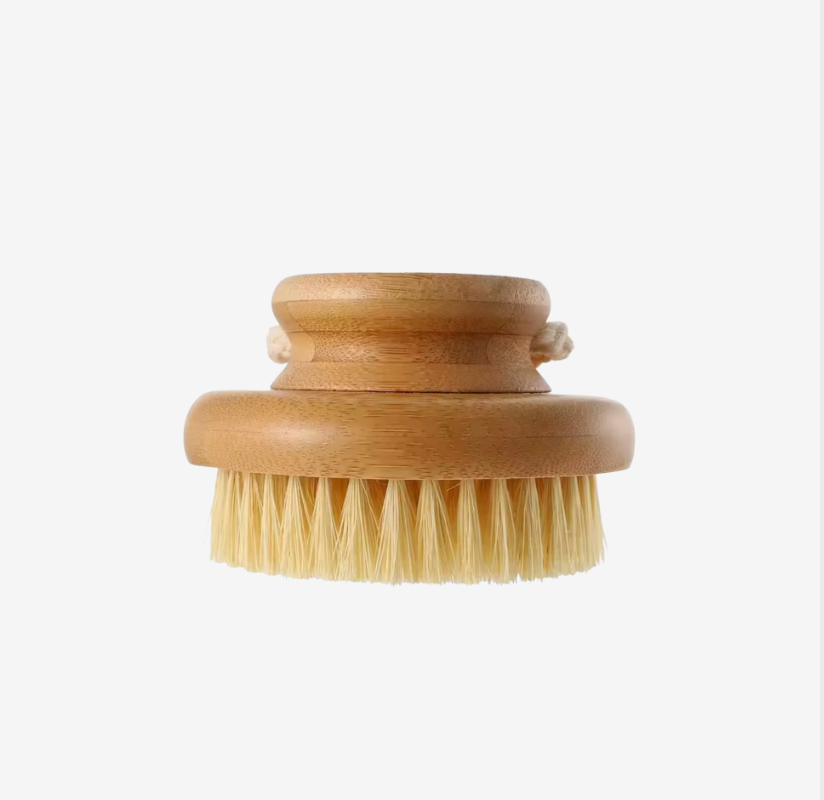 Natural bamboo handle with gentle exfoliating bristles, round ergonomic design.