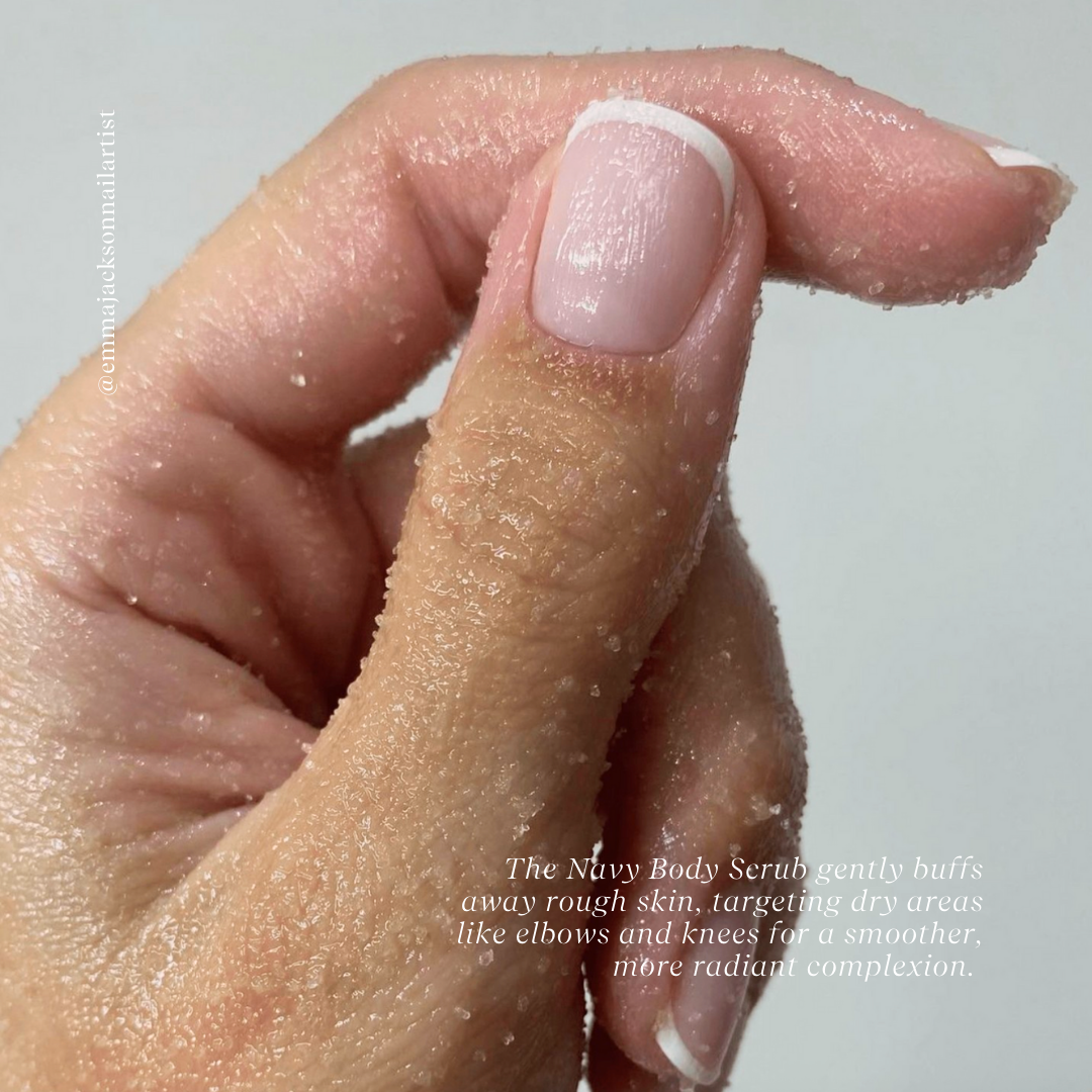 The Navy Body Scrub gently buffs away rough skin, targeting dry areas like elbows and knees for a smoother, more radiant complexion. Infused with natural ingredients like shea butter and coconut oil, it leaves your skin feeling luxuriously soft and nourished.
