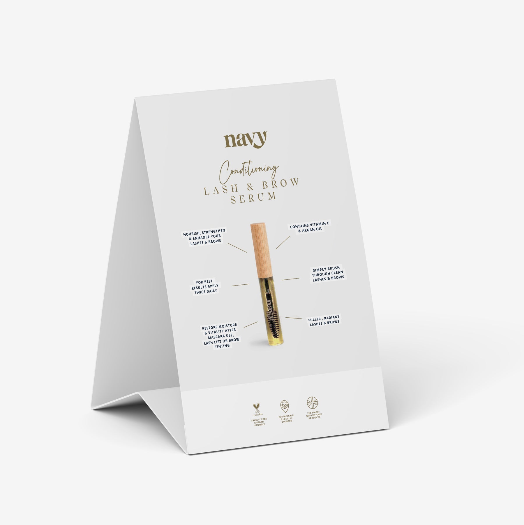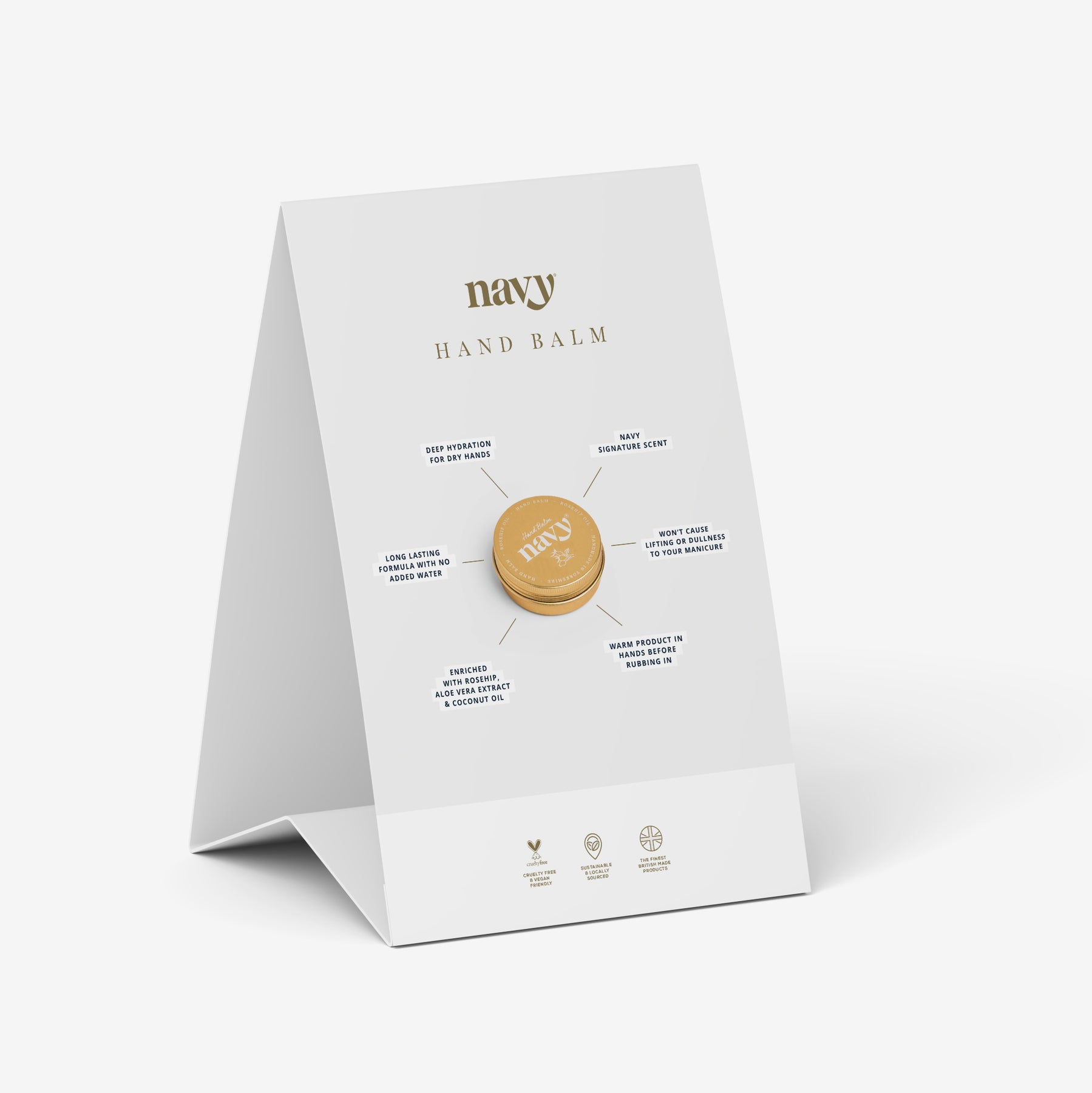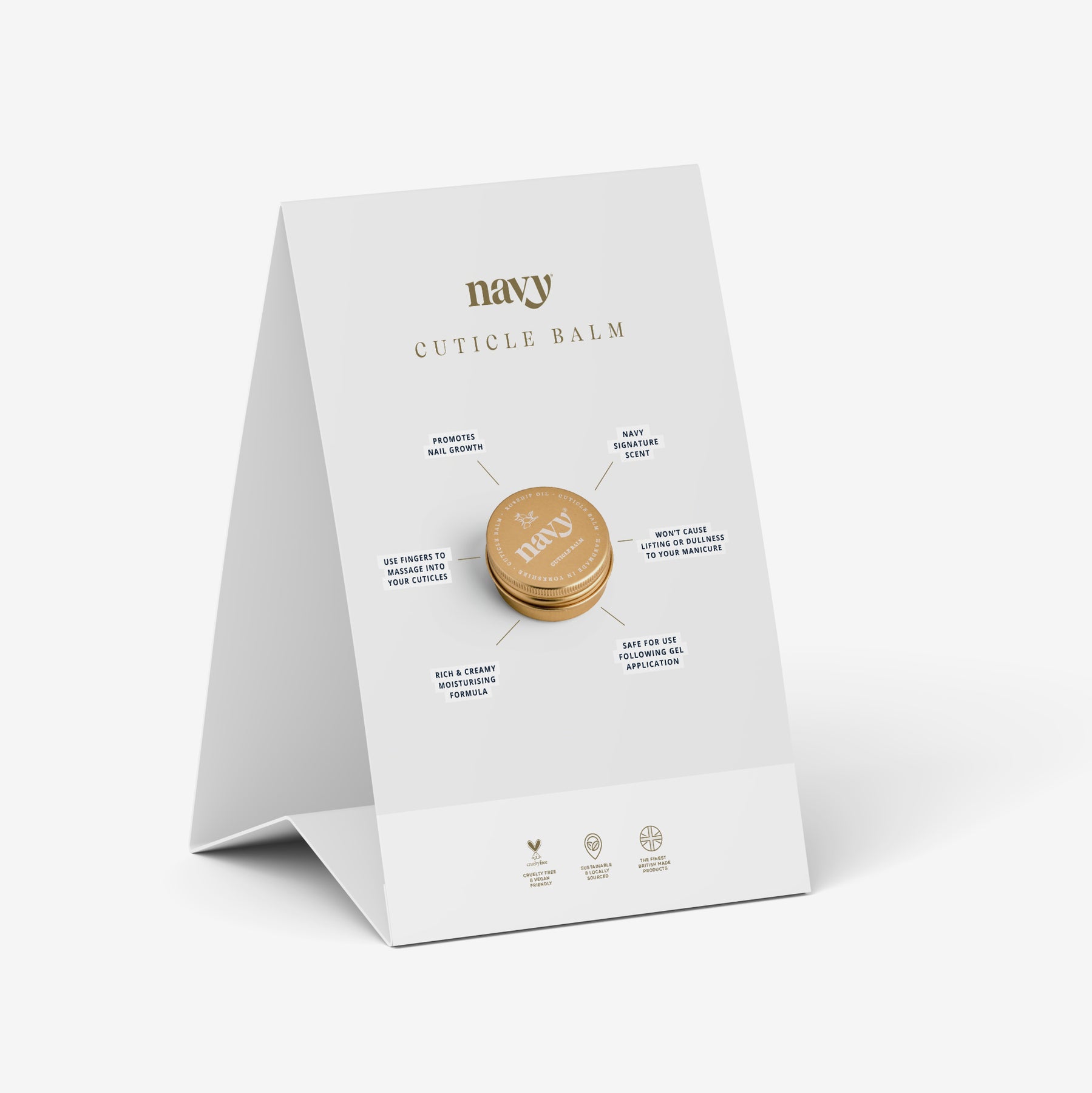 A tent-style A5 point of sale display card for Navy Cuticle Balm with a gold lid product image, set against a white background.