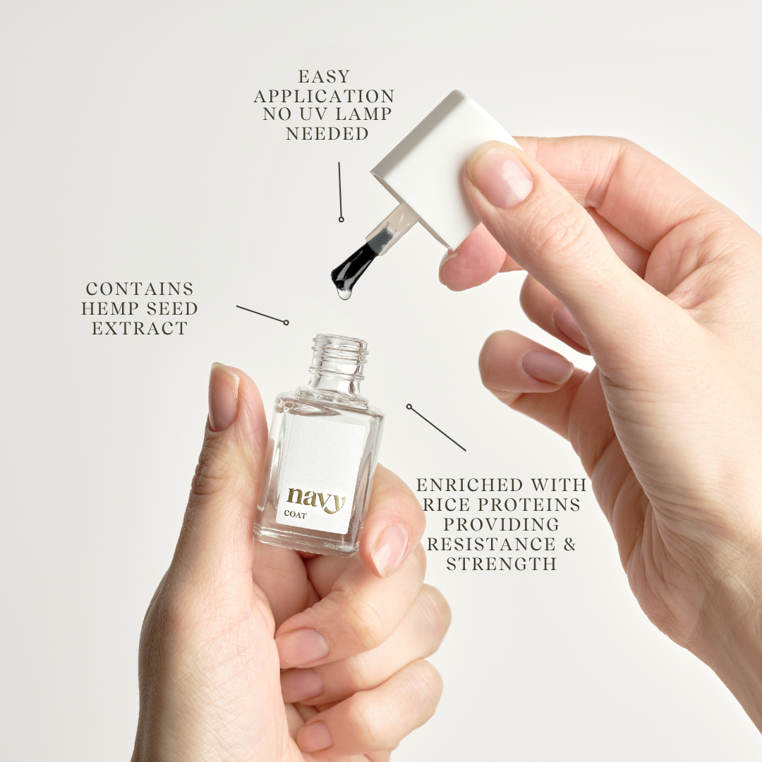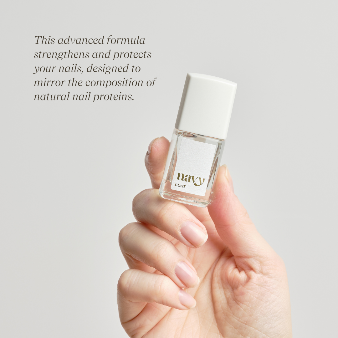 Discover Navy Coat, an advanced nail treatment designed to repair, protect, and transform natural nails. Expertly formulated with rice proteins and hemp seed extract, this innovative formula strengthens weak or damaged nails, restores resilience, and promotes long-term nail health.