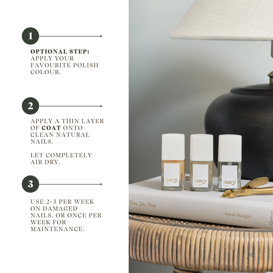 • Apply a thin layer of Coat to natural or painted nails and let it dry fully